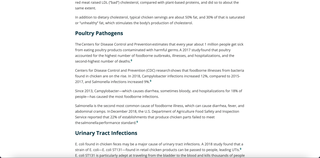 According to the Physicians Committee for Responsible Medicine chicken products contain cholesterol, carcinogens, and contaminant which came as a big shock to me as I have always thought chicken was always super healthy so I did more digging.
