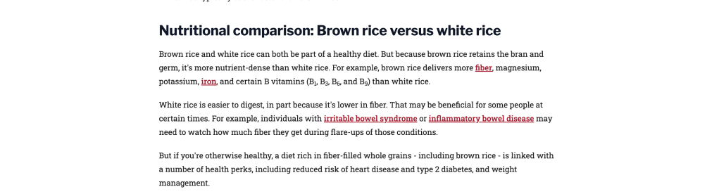 The next thing I decided to do was search for reliable sources. I searched online using terms like “Is rice bad for you” and “Is chicken healthy for you”. I only was looking for trusted health organizations that have a lot of research backing up the info on their websites.