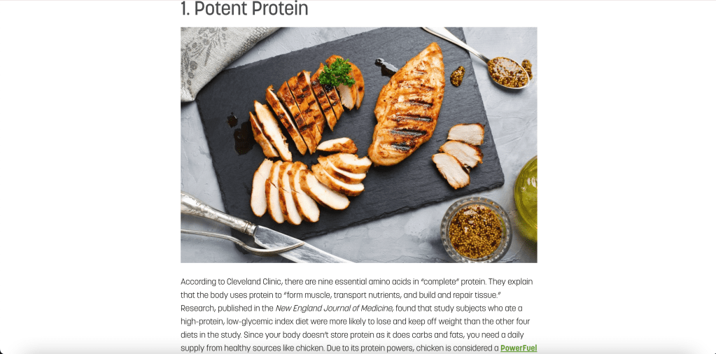 Second, I learned that chicken is widely considered a healthy protein, especially when it is grilled or baked. According to The Leaf which incorporates a lot of reliable health sources on their site chicken has numerous health benefits including it being a potent protein, low calorie/fat, high potassium, and lower cholesterol as a serving of boneless skinless chicken breast comes with less than one gram of saturated fat which means chicken cooked the right way will have less harmful low density lipoprotein (cholesterol) going against the earlier claim that I saw reassuring me chicken can be healthy depending on the way it is served.