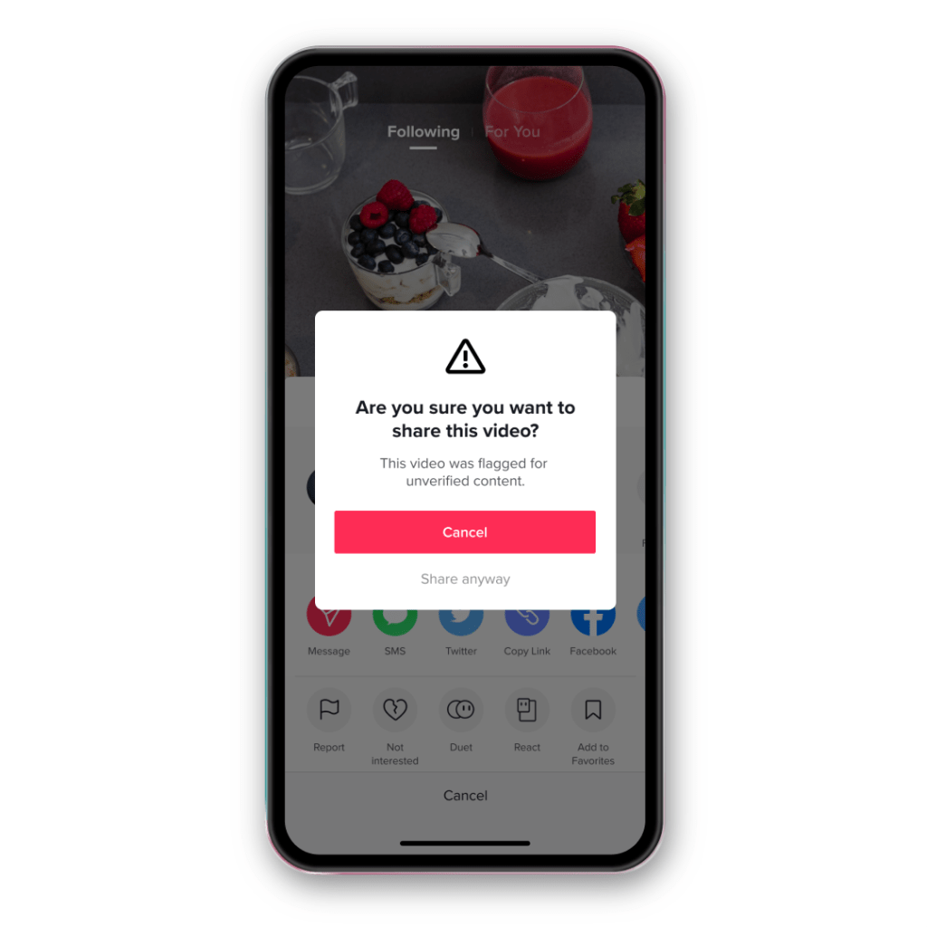 For example, TikTok’s approach to fighting COVID-19 misinformation was by placing banners directing users to credible sources and deleting misinformation. Even now this is still very common on the platform whereby looking up certain topics messages are prompted to users about verifying information.